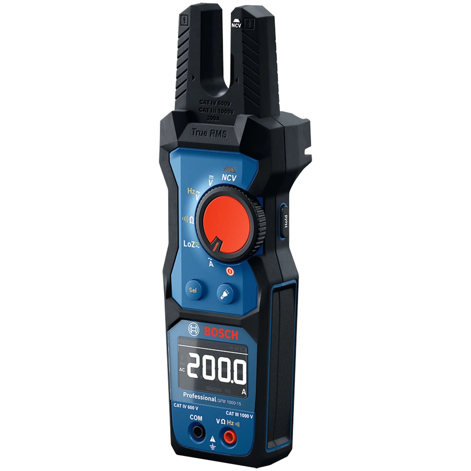 Die Stromklemme Bosch GFM 1000-15, ZuZuverlässiges und robustes True-RMS-Gabelamperemeter mit invertiertem LCD-Display zur schnellen Überprüfung des Wechselstroms.