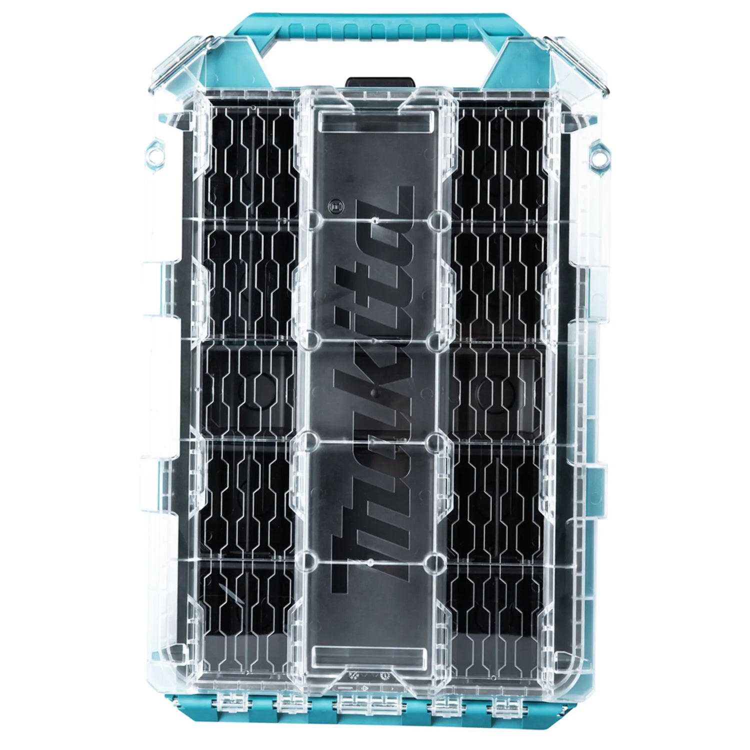 Das Organisatormodul Makita Der Behälter P-91051 dient zum Organisieren, Transportieren und Schützen von kleinen und großen Zubehörteilen und ermöglicht dank des transparenten Deckels und des flachen Profils, das für das Stapeln optimiert ist, eine sofortige Kontrolle über den Inhalt.